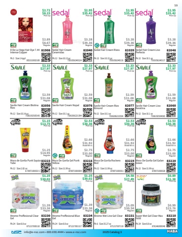 info@e-nsc.com %u2022 800.690.4444 %u2022 www.e-nsc.com 2025 Catalog 3HABASuper Wet Gel Clear Max Hold83210Pick Up$0.89$21.38 876346000048Pk:24 Size:8.8 oz$0.99$23.76RegularXtreme Wet Line Gel Clear83231Pick Up$4.58$27.49 871217007119Pk:6 Size:35.27 oz$5.09$30.54RegularXtreme Proffesional Blue Gel83234Pick Up$1.25$30.02 871217001117Pk:24 Size:8.8 oz$1.39$33.36RegularXtreme Proffesional Clear Gel83230Pick Up$1.25$30.02 871217000110Pk:24 Size:8.8 oz$1.39$33.36RegularMoco De Gorila Gel Galan Green83220Pick Up$2.53$30.36 878971000028Pk:12 Size:11.99 oz$2.66$31.92Asstd 60 cs$2.75$33.00RegularMoco De Gorila Rockero Red83219Pick Up$2.53$30.36 878971000011Pk:12 Size:11.99 oz$2.66$31.92Asstd 60 cs$2.75$33.00RegularMoco De Gorila Gel Punk Yellow83218Pick Up$2.53$30.36 878971000004Pk:12 Size:11.99 oz$2.66$31.92Asstd 60 cs$2.75$33.00RegularMoco de Gorila Punk Squizz Tube83223Pick Up$1.15$13.75 8-7897100003-5Pk:12 Size:2.82 oz$1.25$14.95RegularSavile Hair Cream Liso Keratina82060Pick Up$2.33$27.97 7506192504065Pk:12 Size:10.1 oz$2.59$31.08RegularSavile Hair Cream Rizo Almond82077Pick Up$2.33$27.97 7506306213504Pk:12 Size:10.1 oz$2.59$31.08RegularSavile Hair Cream Nopal82076Pick Up$2.33$27.97 7506306221394Pk:12 Size:10.1 oz$2.59$31.08RegularSavile Hair Cream Biotina Rizo82056Pick Up$2.33$27.97 7506192505543Pk:12 Size:10.14 oz$2.59$31.08RegularSedal Hair Cream Liso Perfecto82048Pick Up$2.95$35.42 7501056340117Pk:12 Size:10.1 oz$3.28$39.36RegularSedal Hair Cream Rizos82039Pick Up$2.95$35.42 7501056340131Pk:12 Size:10.13 oz$3.28$39.36RegularSedal Hair Cream Ceramidas82040Pick Up$2.95$35.42 7501056340124Pk:12 Size:10.13 oz$3.28$39.36RegularD De La Vega Hair Dye 7.44 Intense Copper81908Pick Up$2.72$8.15 855313002100Pk:3 Size:1 Appl$2.89$8.67Regular