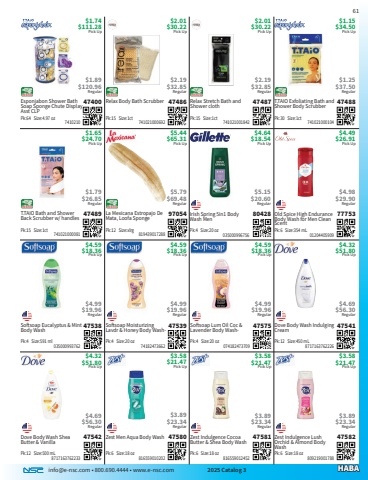 info@e-nsc.com %u2022 800.690.4444 %u2022 www.e-nsc.com 2025 Catalog 3HABAZest Indulgence Lush Orchid & Almond Body Wash47582Pick Up$3.58$21.47 809219001788Pk:6 Size:18 oz$3.89$23.34RegularZest Indulgence Cocoa Butter & Shea Body Wash47581Pick Up$3.58$21.47 816559012452Pk:6 Size:18 oz$3.89$23.34RegularZest Men Aqua Body Wash47580Pick Up$3.58$21.47 816559010202Pk:6 Size:18 oz$3.89$23.34RegularDove Body Wash Shea Butter & Vanilla47542Pick Up$4.32$51.80 8717163762233Pk:12 Size:500 mL$4.69$56.30RegularDove Body Wash Indulging Cream47541Pick Up$4.32$51.80 8717163762226Pk:12 Size:450 mL$4.69$56.30RegularSoftsoap Lum Oil Coc & Lavender Body Wash-47575Pick Up$4.59$18.36 074182473709Pk:4 Size:20 oz$4.99$19.96RegularSoftsoap Moisturizing Lavdr & Honey Body Wash-47539Pick Up$4.59$18.36 74182473662Pk:4 Size:20 oz$4.99$19.96RegularSoftsoap Eucalyptus & Mint Body Wash47538Pick Up$4.59$18.36 035000993762Pk:4 Size:591 ml$4.99$19.96RegularOld Spice High Endurance Body Wash for Men Clean Scent77753Pick Up$4.49$26.91 01204405909Pk:6 Size:354 mL$4.98$29.90RegularIrish Spring 5in1 Body Wash Men80428Pick Up$4.64$18.54 035000996756Pk:4 Size:20 oz$5.15$20.60RegularLa Mexicana Estropajo De Mata, Loofa Sponge97054Pick Up$5.44$65.31 819439017288Pk:12 Size:xlrg$5.79$69.48RegularT.TAIO Bath and Shower Back Scrubber w/ handles47489Pick Up$1.65$24.70 741021000081Pk:15 Size:1ct$1.79$26.85RegularT.TAIO Exfoliating Bath and Shower Body Scrubber47488Pick Up$1.15$34.50 741021000104Pk:30 Size:1ct$1.25$37.50RegularRelax Stretch Bath and Shower cloth47487Pick Up$2.01$30.22 741021001842Pk:15 Size:1ct$2.19$32.85RegularRelax Body Bath Scrubber47486Pick Up$2.01$30.22 741021000692Pk:15 Size:1ct$2.19$32.85RegularEsponjabon Shower Bath Soap Sponge Chute Display Asst CLP47400Pick Up$1.74$111.28 7410210Pk:64 Size:4.97 oz$1.89$120.96Regular