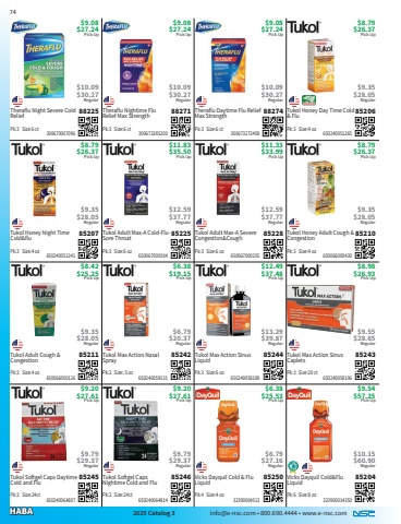 HABA2025 Catalog 3 info@e-nsc.com %u2022 800.690.4444 %u2022 www.e-nsc.comVicks Dayquil Cold&Flu Liquid85204Pick Up$9.54$57.25 323900014350Pk:6 Size:8 oz$10.15$60.90RegularVicks Dayquil Cold & Flu Liquid85250Pick Up$6.38$25.53 32390004513Pk:4 Size:4 oz$6.79$27.16RegularTukol Softgel Caps Nightime Cold and Flu85246Pick Up$9.20$27.61 650240064814Pk:3 Size:24ct$9.79$29.37RegularTukol Softgel Caps Daytime Cold and Flu85245Pick Up$9.20$27.61 650240064807Pk:3 Size:24ct$9.79$29.37RegularTukol Max Action Sinus Caplets85243Pick Up$8.98$26.93 650240058196Pk:3 Size:20 ct$9.55$28.65RegularTukol Max Action Sinus Liquid85244Pick Up$12.49$37.48 650240058189Pk:3 Size:6 oz$13.29$39.87RegularTukol Max Action Nasal Spray85242Pick Up$6.38$19.15 650240059131Pk:3 Size:.5 oz$6.79$20.37RegularTukol Adult Cough & Congestion85211Pick Up$8.42$25.25 650066000126Pk:3 Size:4 oz$9.35$28.05RegularTukol Honey Adult Cough & Congestion85210Pick Up$8.79$26.37 650066000430Pk:3 Size:4 oz$9.35$28.05RegularTukol Adult Max-A Severe Congestion&Cough85228Pick Up$11.33$33.99 650067000255Pk:3 Size:6 oz$12.59$37.77RegularTukol Adult Max-A Cold-FluSore Throat85225Pick Up$11.83$35.50 650067000194Pk:3 Size:6 oz$12.59$37.77RegularTukol Honey Night Time Cold&flu85207Pick Up$8.79$26.37 650240051241Pk:3 Size:4 oz$9.35$28.05RegularTukol Honey Day Time Cold & Flu85206Pick Up$8.79$26.37 650240051265Pk:3 Size:4 oz$9.35$28.05RegularTheraflu Daytime Flu Relief Max Strength88274Pick Up$9.08$27.24 300673272408Pk:3 Size:6 ct$10.09$30.27RegularTheraflu Nightime Flu Relief Max Strength88271Pick Up$9.08$27.24 300673285200Pk:3 Size:6 ct$10.09$30.27RegularTheraflu Night Severe Cold Relief88225Pick Up$9.08$27.24 300670007096Pk:3 Size:6 ct$10.09$30.27Regular