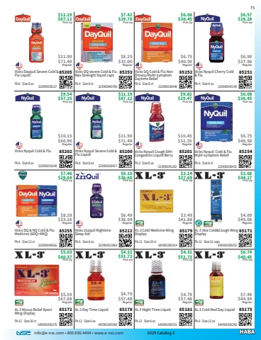 info@e-nsc.com %u2022 800.690.4444 %u2022 www.e-nsc.com 2025 Catalog 3HABAXL-3 Cold Med Day Liquid85175Pick Up$6.74$40.45 645981000283Pk:6 Size:12 oz$7.49$44.94RegularXL-3 Night Time Liquid85181Pick Up$4.31$51.73 645981000351Pk:12 Size:6 oz$4.79$57.48RegularXL-3 Day Time Liquid85178Pick Up$4.31$51.73 645981000368Pk:12 Size:6 oz$4.79$57.48RegularXL-3 Mucus Relief Xpect Wing Display85172Pick Up$5.03$60.37 645981000276Pk:12 Size:20 ct$5.59$67.08RegularXL-3 Xtra Cold&Cough Wing Display85171Pick Up$3.68$44.17 645981000252Pk:12 Size:12 caps$4.09$49.08RegularXL-3 Cold Medicine Wing Display85179Pick Up$3.14$37.69 645981000214Pk:12 Size:20 ct$3.49$41.88RegularVicks Zzzquil Nightime Sleep Aid85212Pick Up$6.10$36.60 323900013964Pk:6 Size:6 oz$6.49$38.94RegularVicks DQ & NQ Cold & Flu Medicine (8DQ+4NQ)85255Pick Up$7.46$29.84 323900040816Pk:4 Size:12 ct$8.29$33.16RegularVicks Nyquil Cold & Flu Multi-symptom Relief85254Pick Up$6.08$36.45 323900038431Pk:6 Size:8 ct$6.75$40.50RegularVicks Nyquil Cough DM+ Congestion Liquid Berry85201Pick Up$9.82$29.47 323900041202Pk:3 Size:8 oz$10.45$31.35RegularVicks Nyquil Severe Cold & Flu Liquid85200Pick Up$11.19$67.12 323900038417Pk:6 Size:8 oz$11.90$71.40RegularVicks Nyquil Cold & Flu85202Pick Up$9.54$57.25 323900014244Pk:6 Size:8 oz$10.15$60.90RegularVicks Nyquil Cherry Cold & Flu85251Pick Up$6.57$26.28 323900045149Pk:4 Size:4 oz$6.99$27.96RegularVicks DQ Cold & Flu Non Drowsy Multi-symptom Daytime Relief85252Pick Up$6.08$36.45 323900038448Pk:6 Size:8 ct$6.75$40.50RegularVicks DQ severe Cold & Flu Max Strenght liquid caps85253Pick Up$7.42$29.70 323900040786Pk:4 Size:8 ct$8.25$33.00RegularVicks Dayquil Severe Cold & Flu Liquid85205Pick Up$11.19$67.12 323900038127Pk:6 Size:8 oz$11.90$71.40Regular