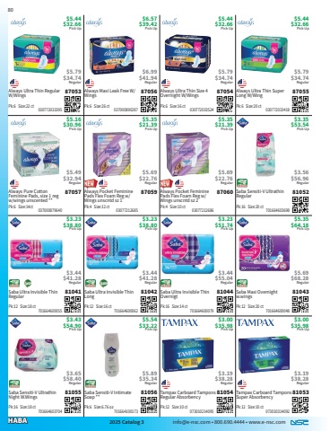 HABA2025 Catalog 3 info@e-nsc.com %u2022 800.690.4444 %u2022 www.e-nsc.comTampax Carboard Tampons Super Absorbency81053Pick Up$3.00$35.98 073010314092Pk:12 Size:10 ct$3.19$38.28RegularTampax Carboard Tampons Regular Absorbency81054Pick Up$3.00$35.98 073010214095Pk:12 Size:10 ct$3.19$38.28RegularSaba Sensiti-V Intimate Soap **81056Pick Up$5.54$33.22 701664100173Pk:6 Size:6.76 oz$5.89$35.34RegularSaba Sensiti-V Ultrathin Night W.Wings81055Pick Up$3.43$54.90 701664603704Pk:16 Size:18 ct$3.65$58.40RegularSaba Maxi Overnight w.wings81043Pick Up$5.35$64.18 701664600048Pk:12 Size:20 ct$5.69$68.28RegularSaba Ultra Invisible Thin Overnigt81044Pick Up$3.23$51.74 701664600079Pk:16 Size:14 ct$3.44$55.04RegularSaba Ultra Invisible Thin Long81042Pick Up$3.23$38.80 701664600062Pk:12 Size:16 ct$3.44$41.28RegularSaba Ultra Invisible Thin Regular81041Pick Up$3.23$38.80 701664600055Pk:12 Size:18 ct$3.44$41.28RegularSaba Sensiti-V Ultrathin Regular81052Pick Up$3.35$53.54 701664603698Pk:16 Size:20 ct$3.56$56.96RegularAlways Pocket Feminine Pads Flex Foam Reg w/Wings unscntd sz 287060Pick Up$5.35$21.39 03077212686Pk:4 Size:10 ct$5.69$22.76RegularAlways Pocket Feminine Pads Flex Foam Reg w/Wings unscntd sz 187059Pick Up$5.35$21.39 03077212685Pk:4 Size:12 ct$5.69$22.76RegularAlways Pure Cotton Feminine Pads, size 1 reg w/wings unscented **87057Pick Up$5.16$30.96 037000879640Pk:6 Size:14ct$5.49$32.94RegularAlways Ultra Thin Super Long W/Wing87055Pick Up$5.44$32.66 030772033418Pk:6 Size:20 ct$5.79$34.74RegularAlways Ultra Thin Size 4 Overnight W/Wings87054Pick Up$5.44$32.66 030772033524Pk:6 Size:16 ct$5.79$34.74RegularAlways Maxi Leak Free W/Wings87056Pick Up$6.57$39.42 037000890287Pk:6 Size:26 ct$6.99$41.94RegularAlways Ultra Thin Regular W/Wings87053Pick Up$5.44$32.66 030772033395Pk:6 Size:22 ct$5.79$34.74Regular