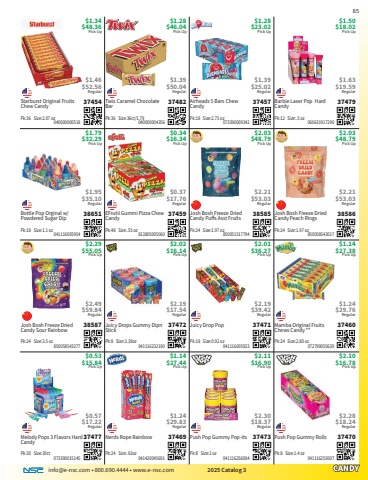 info@e-nsc.com %u2022 800.690.4444 %u2022 www.e-nsc.com 2025 Catalog 3CANDYPush Pop Gummy Rolls37470Pick Up$2.10$16.78 041116255007Pk:8 Size:1.4 oz$2.28$18.24RegularPush Pop Gummy Pop-its37473Pick Up$2.11$16.90 041116256004Pk:8 Size:2 oz$2.30$18.37RegularNerds Rope Rainbow37469Pick Up$1.14$27.44 041420045691Pk:24 Size:.92oz$1.24$29.83RegularMelody Pops 3 Flavors Hard Candy37477Pick Up$0.53$15.84 073390015145Pk:30 Size:30ct$0.57$17.22RegularMamba Original Fruits Chews Candy **37460Pick Up$1.14$27.38 072799055639Pk:24 Size:2.80 oz$1.24$29.76RegularJuicy Drop Pop37471Pick Up$2.01$36.27 041116005923Pk:18 Size:0.92 oz$2.19$39.42RegularJuicy Drops Gummy Dipn Stick37472Pick Up$2.02$16.14 041116232190Pk:8 Size:3.39oz$2.19$17.54RegularJosh Bosh Freeze Dried Candy Sour Rainbow38587Pick Up$2.29$55.05 850058543277Pk:24 Size:3.5 oz$2.49$59.84RegularJosh Bosh Freeze Dried Candy Peach Rings38586Pick Up$2.03$48.79 850058543017Pk:24 Size:1.97 oz$2.21$53.03RegularJosh Bosh Freeze Dried Candy Puffs Asst Fruits38585Pick Up$2.03$48.79 850051517794Pk:24 Size:1.97 oz$2.21$53.03RegularEFrutii Gummi Pizza Chew Candy37459Pick Up$0.34$16.34 813805005060Pk:48 Size:.55 oz$0.37$17.76RegularBottle Pop Orginal w/ Powdered Sugar Dip38651Pick Up$1.79$32.29 041116005954Pk:18 Size:1.1 oz$1.95$35.10RegularBarbie Laser Pop Hard Candy37479Pick Up$1.50$18.02 060631917290Pk:12 Size:.5 oz$1.63$19.59RegularAirheads 5 Bars Chew Candy37457Pick Up$1.28$23.02 073390009342Pk:18 Size:2.75 oz$1.39$25.02RegularTwix Caramel Chocolate Bar37482Pick Up$1.28$46.04 040000004356Pk:36 Size:36ct/1.79$1.39$50.04RegularStarburst Original Fruits Chew Candy37454Pick Up$1.34$48.36 040000000518Pk:36 Size:2.07 oz$1.46$52.56Regular