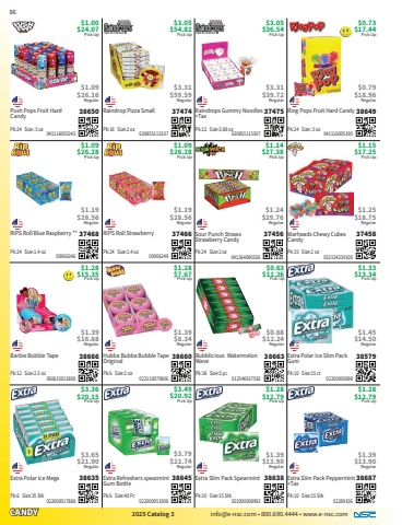 CANDY2025 Catalog 3 info@e-nsc.com %u2022 800.690.4444 %u2022 www.e-nsc.comExtra Slim Pack Peppermint +Tax38687Pick Up$1.28$12.79 02289106Pk:10 Size:15 Stk$1.39$13.90RegularExtra Slim Pack Spearmint38638Pick Up$1.28$12.79 022000008992Pk:10 Size:15 Stk$1.39$13.90RegularExtra Refreshers spearmint Gum Bottle38645Pick Up$3.49$20.92 022000051908Pk:6 Size:40 Pc$3.79$22.74RegularExtra Polar Ice Mega38635Pick Up$3.36$20.15 022000017888Pk:6 Size:35 Stk$3.65$21.90RegularExtra Polar Ice Slim Pack Gum38579Pick Up$1.33$13.34 02200000898Pk:10 Size:15 ct$1.45$14.50RegularBubblicious Watermelon Wave38663Pick Up$0.63$11.26 012546917582Pk:18 Size:5 pc$0.68$12.24RegularHubba Bubba Bubble Tape Original38660Pick Up$1.28$7.67 022110079806Pk:6 Size:2 oz$1.39$8.34RegularBarbie Bubble Tape38666Pick Up$1.28$15.35 060631921808Pk:12 Size:2.5 oz$1.39$16.68RegularWarheads Chewy Cubes Candy37458Pick Up$1.15$17.25 032134239100Pk:15 Size:2 oz$1.25$18.75RegularSour Punch Straws Strawberry Candy37456Pick Up$1.14$27.38 041364080536Pk:24 Size:2 oz$1.24$29.76RegularRIPS Roll Strawberry37466Pick Up$1.09$26.28 00906249Pk:24 Size:1.4 oz$1.19$28.56RegularRIPS Roll Blue Raspberry **37468Pick Up$1.09$26.28 00906346Pk:24 Size:1.4 oz$1.19$28.56RegularRing Pops Fruit Hard Candy38649Pick Up$0.73$17.44 041116005190Pk:24 Size:.5 oz$0.79$18.96RegularRaindrops Gummy Noodles +Tax37475Pick Up$3.05$36.54 630855115507Pk:12 Size:3.88 oz$3.31$39.72RegularRaindrop Pizza Small37474Pick Up$3.05$54.82 630855113107Pk:18 Size:2 oz$3.31$59.59RegularPush Pops Fruit Hard Candy38650Pick Up$1.00$24.07 041116005343Pk:24 Size:.5 oz$1.09$26.16Regular