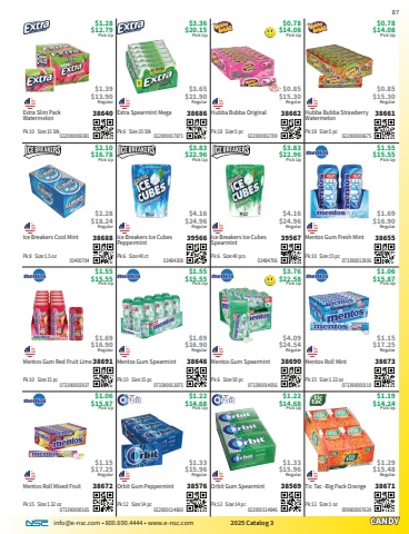 info@e-nsc.com %u2022 800.690.4444 %u2022 www.e-nsc.com 2025 Catalog 3CANDYTic Tac -Big Pack Orange38671Pick Up$1.19$14.24 009800007639Pk:12 Size:1 oz$1.29$15.48RegularOrbit Gum Spearmint38569Pick Up$1.22$14.68 022000114846Pk:12 Size:14 pc$1.33$15.96RegularOrbit Gum Peppermint38576Pick Up$1.22$14.68 022000114860Pk:12 Size:14 pc$1.33$15.96RegularMentos Roll Mixed Fruit38672Pick Up$1.06$15.87 073390000165Pk:15 Size:1.32 oz$1.15$17.25RegularMentos Roll Mint38673Pick Up$1.06$15.87 073390000110Pk:15 Size:1.32 oz$1.15$17.25RegularMentos Gum Spearmint38690Pick Up$3.76$22.58 073390014056Pk:6 Size:50 pc$4.09$24.54RegularMentos Gum Spearmint38648Pick Up$1.55$15.55 073390013875Pk:10 Size:15 pc$1.69$16.90RegularMentos Gum Red Fruit Lime38691Pick Up$1.55$15.55 073390003937Pk:10 Size:15 pc$1.69$16.90RegularMentos Gum Fresh Mint38655Pick Up$1.55$15.55 073390013936Pk:10 Size:15 pc$1.69$16.90RegularIce Breakers Ice Cubes Spearmint39567Pick Up$3.83$22.96 03484706Pk:6 Size:40 pcs$4.16$24.96RegularIce Breakers Ice Cubes Peppermint39566Pick Up$3.83$22.96 03484308Pk:6 Size:40 ct$4.16$24.96RegularIce Breakers Cool Mint38688Pick Up$2.10$16.78 03400704Pk:8 Size:1.5 oz$2.28$18.24RegularHubba Bubba Strawberry Watermelon38661Pick Up$0.78$14.08 022000000675Pk:18 Size:5 pc$0.85$15.30RegularHubba Bubba Original38662Pick Up$0.78$14.08 022000002709Pk:18 Size:5 pc$0.85$15.30RegularExtra Spearmint Mega38686Pick Up$3.36$20.15 022000017871Pk:6 Size:35 Stk$3.65$21.90RegularExtra Slim Pack Watermelon38640Pick Up$1.28$12.79 022000008381Pk:10 Size:15 Stk$1.39$13.90Regular
