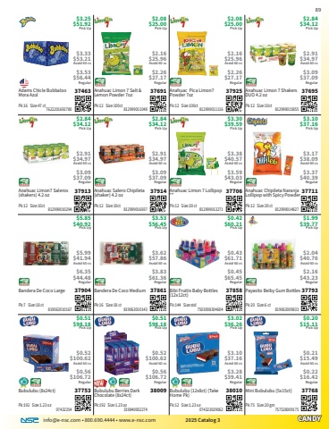 info@e-nsc.com %u2022 800.690.4444 %u2022 www.e-nsc.com 2025 Catalog 3CANDYMini Bubulubu (5x15ct)37768Pick Up$0.20$15.11 757528009175Pk:75 Size:20 gm$0.21$15.49Asstd 60 cs$0.22$16.42RegularBubulubu (12x8ct) (Take Home Pk)38010Pick Up$3.02$36.26 074323029062Pk:12 Size:1.23 oz$3.10$37.16Asstd 60 cs$3.28$39.41RegularBubulubu Berries Dark Chocolate (8x24ct)38009Pick Up$0.51$98.18 319840002274Pk:192 Size:1.23 oz$0.52$100.62Asstd 60 cs$0.56$106.72RegularBubulubu (8x24ct)37753Pick Up$0.51$98.18 07432354Pk:192 Size:1.23 oz$0.52$100.62Asstd 60 cs$0.56$106.72RegularPayasito Beiby Gum Bottles37793Pick Up$1.99$39.77 819063009833Pk:20 Size:6 ct$2.04$40.76Asstd 60 cs$2.16$43.23RegularBibi Fruitix Baby Bottles (12x12ct)37858Pick Up$0.42$60.21 7503008304604Pk:144 Size:std$0.43$61.71Asstd 60 cs$0.45$65.45RegularBandera De Coco Medium37861Pick Up$3.53$56.45 819063010143Pk:16 Size:18 ct$3.62$57.86Asstd 60 cs$3.83$61.36RegularBandera De Coco Large37904Pick Up$5.85$40.92 819063010167Pk:7 Size:18 ct$5.99$41.94Asstd 60 cs$6.35$44.48RegularAnahuac Chipileta Naranja Lollipop with Spicy Powder37711Pick Up$3.10$37.16 812999014827Pk:12 Size:30 ct$3.17$38.09Asstd 60 cs$3.37$40.39RegularAnahuac Limon 7 Lollipop **37706Pick Up$3.30$39.59 812999013271Pk:12 Size:30 ct$3.38$40.57Asstd 60 cs$3.59$43.03RegularAnahuac Salero Chipileta (shaker) 4.2 oz37914Pick Up$2.84$34.12 812999016937Pk:12 Size:10ct$2.91$34.97Asstd 60 cs$3.09$37.09RegularAnahuac Limon7 Saleros (shakers) 4.2 oz37913Pick Up$2.84$34.12 812999010294Pk:12 Size:10ct$2.91$34.97Asstd 60 cs$3.09$37.09RegularAnahuac Limon 7 Shakers DUO 4.2 oz37695Pick Up$2.84$34.12 812999015855Pk:12 Size:10ct$2.91$34.97Asstd 60 cs$3.09$37.09RegularAnahuac Pica Limon7 Powder 7oz37925Pick Up$2.08$25.00 812999011116Pk:12 Size:100ct$2.16$25.96Asstd 60 cs$2.26$27.17RegularAnahuac Limon 7 Salt & Lemon Powder 7oz37691Pick Up$2.08$25.00 812999011048Pk:12 Size:100ct$2.16$25.96Asstd 60 cs$2.26$27.17RegularAdams Chicle Bubbaloo Mora Azul37463Pick Up$3.25$51.92 7622201692780Pk:16 Size:47 ct$3.33$53.21Asstd 60 cs$3.53$56.44Regular